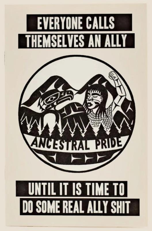 Xhopakelxhit, a member of Ancestral Pride, (some badass, grassroots, indigenous, direct action land defenders from unceded Ahousat territory) made this zine about how to be anti-racist/anti-capitalist white settler ally to people in all kinds of struggles—indigenous and otherwise. Featuring artwork from Gord Hill and Annie Banks, it offers very concrete action ideas and resources that anyone can empower themselves with in the battle for restorative justice and building allies with settlers. 15% of the proceeds will go to supporting Ancestral Pride.