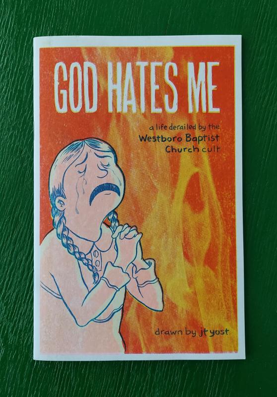 In this brutal recounting of Lauren Drain's experience with the infamous Westboro Baptist Church, their abusive family, and ultimate escape, author and illustrator J.T. Yost brings the reader into the world of WBC to reveal its bigoted machinations. Using comics depicting the dynamic at home as well as at the church, Yost shows the reader the toxic theology of Westboro Baptist Church in all its Calvinist and Puritanical horror. Drain's family is kept under the thumb of her violent and authoritarian father, and Drain is ultimately spared from a life under the auspices of the WBC because her father kicks her out after discovering her DMs with a boy outside of the church. A moving and enraging zine, God Hates Me shows the depths of the depravity of certain strains of American evangelicalism and the difficulties of extricating someone from the unforgiving theological rules that govern the would-be faithful.
